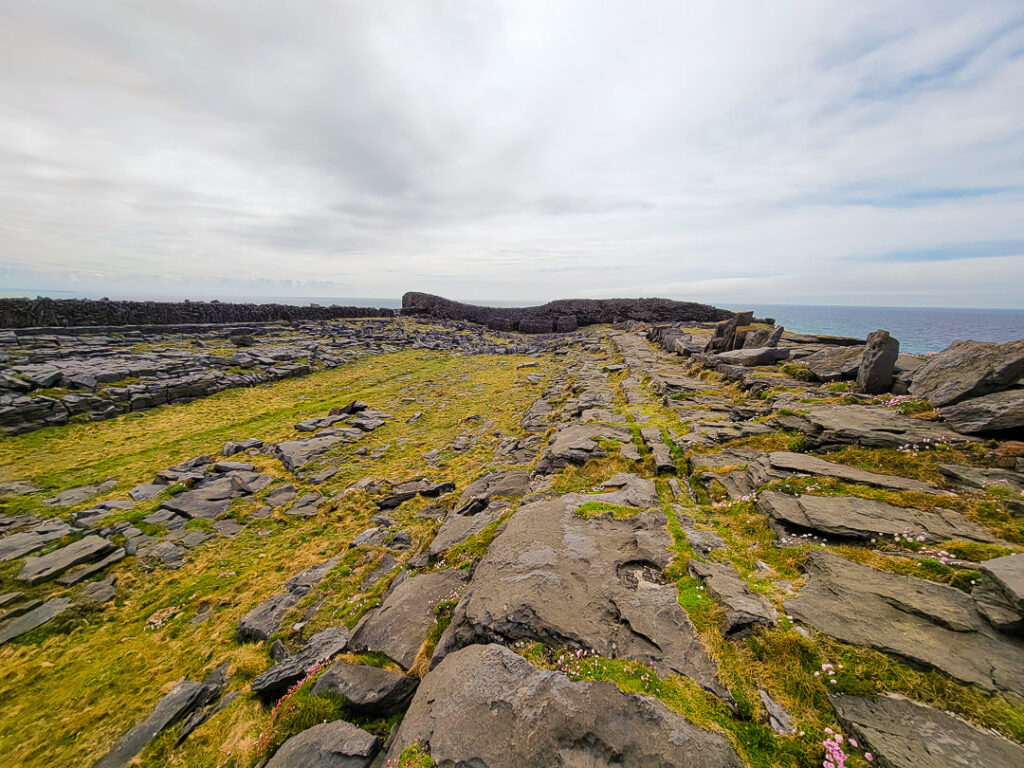 While pedaling toward Dún Dúchathair (Black Fort), we had to pull over to let a car pass. While stationary on the bike, next to a briar bush, I couldn’t get my leg down to the ground quickly enough and toppled right into it. I ended up with a few scratches and some thorns in my hand, but honestly, the only thing that really hurt was my pride.