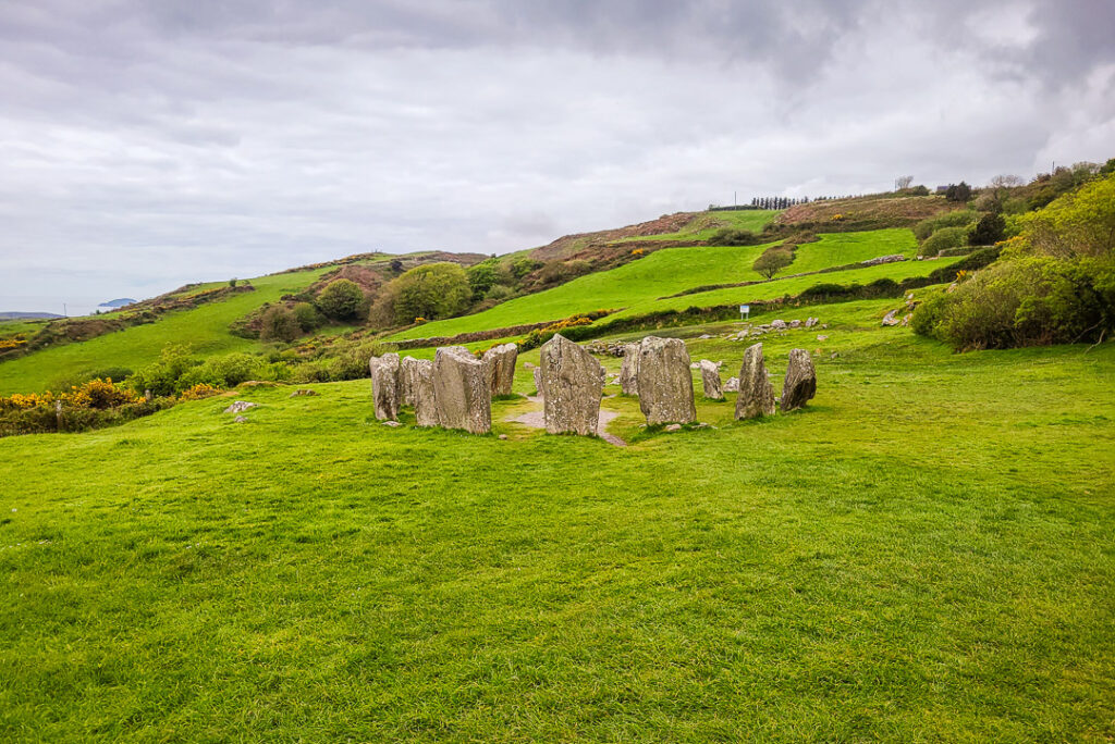 Saying slán to Phil was bittersweet, as she was such a sweet soul and brought us joy every morning during our breakfast encounters. But alas, we navigated towards our ultimate destination, Dingle. With some stops planned along the way, we drove towards Killarney and a quick stop at Drombeg Stone Circle. The Drombeg Stone Circle is ancient and consists of 17 standing stones. Excavations have uncovered an urn burial at its center, dating back to 153 BC to 127 AD. In 1957 and 1958, further excavations unveiled cremated bones within a deliberately broken pot, cloth-wrapped, and buried near the circle’s center.