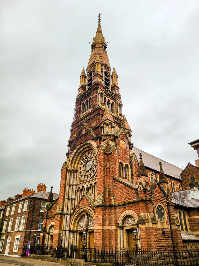 A few blocks out, the cathedral announced itself. Its 141‑foot spire rose above the neighborhood rooftops, a sharp silhouette against the sky. As we got closer, the medieval stone exterior came into view, framed by St. Patrick’s Park and a scattering of centuries‑old graves.